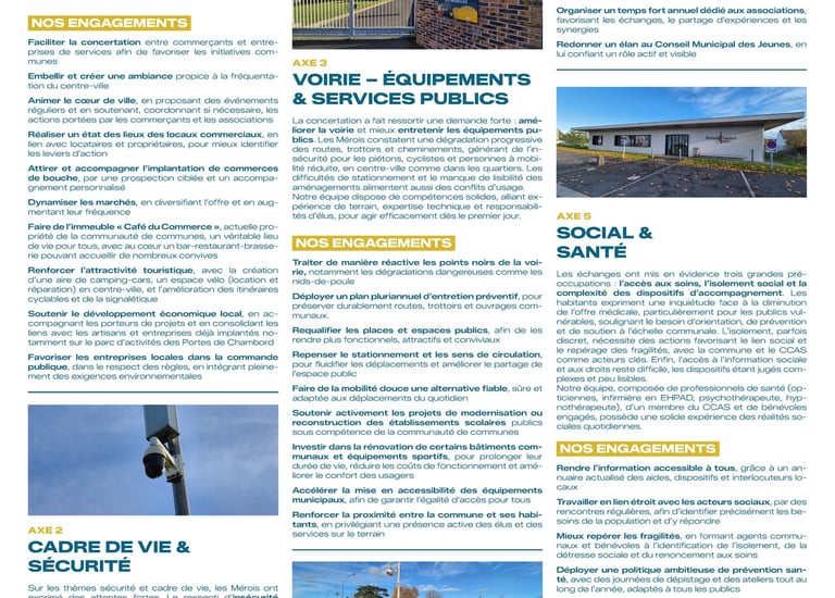 Depuis le premier jour, notre démarche est guidée par l’écoute. Écoute des habitants, écoute des acteurs locaux, écoute des femmes et des hommes qui composent notre équipe. De ces échanges est né un programme structuré autour de cinq axes majeurs, directement issus de vos préoccupations : dynamisme économique et commercial, cadre de vie et sécurité, voirie et services publics, vie associative et animation, action sociale et santé.